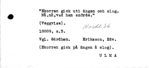 //// "Ekorren gick uti ängen och slog. //// ^ Nå,nå,vad han snörde." //// (Vaggvisa). ^ //// 18809 ^ s+5+ //// ..... - - - - - //// Vgl. Gärdhem. Eriksson, Edv. //// t //// (Ekorren gick på ängen å slog). //// s //// U L M A ////
