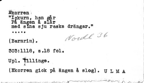 //// Ekorren; //// "Ickurn, han gar //// På ängen å slår //// med sina sju raska drängar." //// * * * * * //// (Barnrim). //// 303:1118, s.18 fol. //// Upl. ^lllinge. //// (Ekorren gick på ängen å slog). U L M A ////