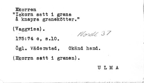 //// Ekorren //// "Iokorn satt i gr ana //// å knapra granekötter." //// (Vaggvisa). //// 175:74 c, s.10. //// < //// ögl. VädeMtad, Okänd hand. //// (Ekorrn satt i granen). //// U L M A //// ' _____, ___.___;____. ...---.----... - ____---- ---;----i-, -^ ... -.-A -----1 ----v-----, ----.-t* ////