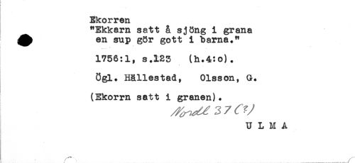 //// - //// Ekorren //// "Ekkarn satt å sjöng i grana //// A en sup gör gott i barna." //// f //// * //// 1756:1, s.125 (h.4:o). //// ögl. Hällestad, Olsson, G. //// (Ekorrn satt i granen). //// U L M Å ////