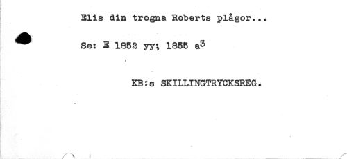 //// Elis din trogna Roberts plågor... //// i ' ' //// ^ Se: E 1852 yy; 1855 a^ //// KB:s SKILLINGTRYCKSREG. //// ...r ////