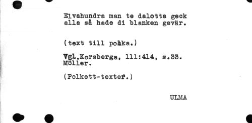 //// Elvahundra man te dalotta geck //// alla så hade di blänken gevär. //// (text till poMca.) //// Ht //// * //// Vgl.Korsberga, 111:414, s.33. //// Möller. //// (Polkett-textef.) //// ULMA //// a ,. ////