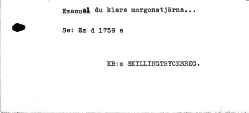 //// Emanueå du klara morgonstjärna... //// ^^ Se: Zz d 1759 a //// KB:s SKILLINGTRYCKSREG. //// } //// - v -. . . . .._____.. . - - - ^ _.v-, ...^.s : ^ /^f ' ////