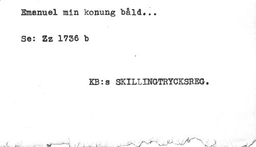 //// Emanuel min konung båld... //// Se: Zz 1736 b //// * //// KB:s SKILLINGTRYCKSREG. ////