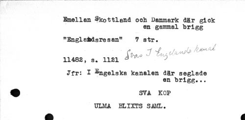 //// Emellan Skottland och Danmark där gick //// en gammal brigg //// "Engla&dsresan^ 7 str. //// 11482, s. 1121 ^ ^ ^ //// Jfr: I ^ngelska kanalen där seglade //// en brigg... //// ^ SVA KOP //// ULMA BLIXTS SAML. ////