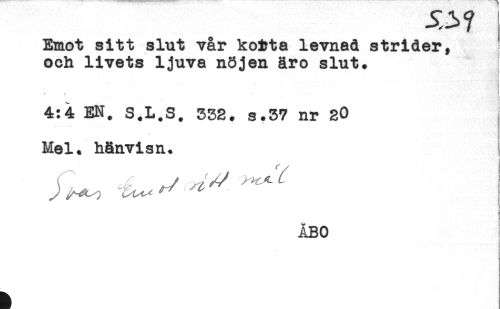 //// -S3? //// Emot sitt slut vår kotta levnad strider, //// och livets ljuva nöjen åro slut. //// - //// * * -- //// 4:4 EN. 332. s.37 nr 20 //// Mel. hänvisn. //// s //// ji //// ÅBO ////