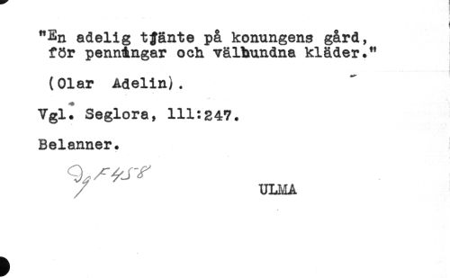 //// "En adelig t#änte på konungens gård, //// för penningar och välhundna kläder." //// (Olar Adelin). //// Vgll Seglora, 111:247. //// Belanner. //// ULMA ////