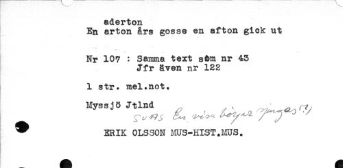 //// f - //// aderton //// En arton års gosse en afton gick ut //// r //// . //// - -. - - - //// t '* ^ //// Nr 10? : Samma text såm nr 43 //// Jfr även nr 122 //// 1 str. mel.not. //// Myssjö Jtlnd . ^ //// ^ ERIK OLSSON HUS-HIST.MUS. ////