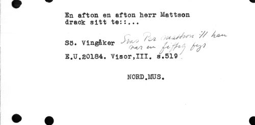 //// En afton en afton herr Mattson //// drack sitt te::... //// S8. Vingåker ^ J, ^." ^ //// E.U.20184. Visor,III. s.519 //// NORD.MUS. ////
