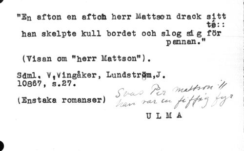 //// "En afton en aftoh herr Mattson drack sitt //// han skelpte kull bordet och slog st g för //// p annan." //// * //// (Visan om "herr Mattson"). //// Sdml. V,vingåker, LundstrHm,J. //// 10867, s.27. , ^^ ^ //// (Enstaka romanser) ,, ^ /^/r 7 //// i //// i //// I ////