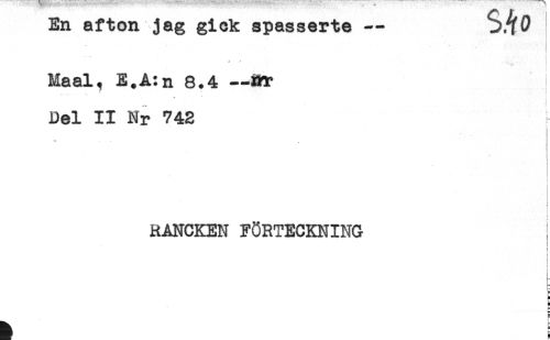 //// En afton jag gick spasserte - S.^fO //// * //// Maal, E.A:n 8.4 -ar //// * * t //// ) //// < //// Del II Nr 742 //// -n //// HANCKEN FORTECKNING //// < ////