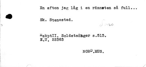 //// i - //// t //// En afton jag låg i en rännnten så full... //// F //// << ___ //// Sk. Stenestad. //// ! //// ( //// ^skptll. Soldatsåhger s.513. //// < //// NOR^.MUS. //// i //// } //// ! //// c //// ; r.......- r ////
