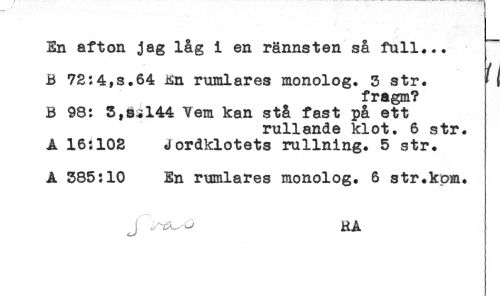 //// B 72:4,s.64 Rn rumlares monolog. 3 str. //// fragm? //// B 98: 3,sgl44 Vem kan stå fast på ett //// rullande klot. 6 str. //// A 16:102 Jordklotets rullning. 5 str. //// A 385:10 En rumlares monolog. 6 str.kom. //// RA ////