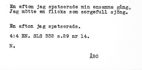 //// En afton jag spatserade min ensamma gång, //// Jag mötte en flicka som sorgefull sjöng. //// En afton jag spatserade. //// 4:4 EN. SLS 332 s.29 nr 14. //// N. ////