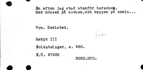 //// En afton jag stod utanför baracken, //// Med mössan på nacken,och kappan på axeln... //// . * //// Vrm. Karlstad. //// j //// Mskpt III //// Soldatsånger, s. 668. //// E.U. 27232 ////