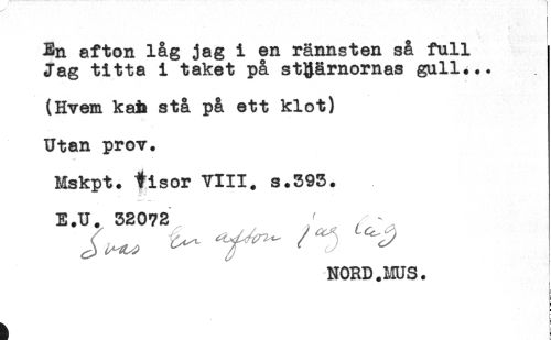 //// En afton låg jag i en rännsten så full //// Jag titta i taket på stjärnornas gull... //// (Hvem kah stå på ett klot) //// Utan prov. //// Mskpt. fisor VIII. s.393. //// E.U. 52072 / , ^ //// NORD.MUS. //// ! //// ^ ] ////