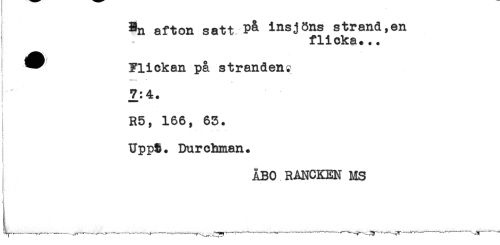 //// I, ' - //// t, //// : //// ^n afton satt P^ insjöns stranden //// flicka... //// y . ... //// ill Th //// * Flickan på stranden; //// 7:4. //// i //// R5, 166, 63. //// * //// t? //// UppSB. Durchman. //// ! //// ÅBO RANCKEN MS ////