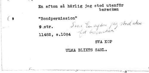 //// En afton så härlig jag stod utanför //// baracken //// f $ "Bondpermission" //// 11482, S.1M4 ' ^ //// SVA KOP //// < //// UU^A BLIXTS SAML. //// t //// / _____-......- ' //// L-.....-....... ....... ....-----^r-----___- ////