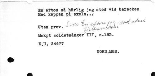 //// En afton så härlig jag stod vid baraoken //// Med kappan på axeln... //// utan prov. ^ //// Mskpt soldatsånger III, s.183. //// E.U. 24677 //// NORD.MUS. ////
