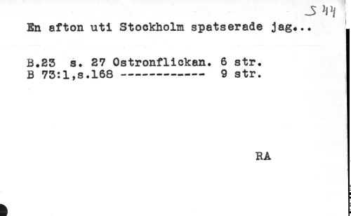 //// En afton uti Stockholm spatserade jag... . //// B.23 s. 27 Ostronflickan. 6 str. j //// B 73:1,s.168--- 9 str. ] //// RA I ////