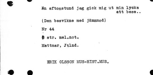 //// En aftonstund jag gick nig ut min lycka //// att bese.. //// (Den besvikne med jämnmod) //// Nr 44 //// 8 str. mel.not. //// % //// Mattmar, Jtlnd. //// ERIK OLSSON MUS-HIST.MUS. ////