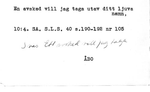 //// En avsked vill jag taga utav ditt ljuva //// namn, //// t //// 10:4. SA. S.L.S. 40 s.190-192 nr 105 //// ! //// ÅBO //// ' . //// ____ _____ ____„..,.. ....-......-_____ - - - - ___ ^ ////