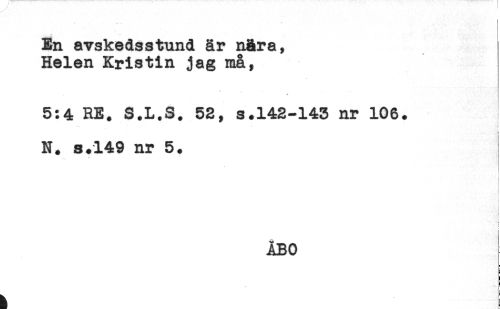 //// En avskedsstund är n&ra, //// Helen Kristin jag må, //// 5:4 RE. S.L.S. 52, s.142-143 nr 106. //// < //// - //// N. s.149 nr 5. //// ÅBO ////