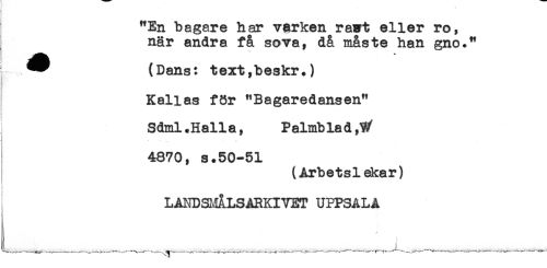 //// T //// "En bagare har verken ravt eller ro, //// när andra få sova, då måste han gno." //// * (Dans: text,beskr.) //// Kallas för "Bagaredansen" //// t //// Sdml.Halla, Palmblad,W //// *< //// 4870, s.50-51 //// (Arbetslekar) //// LANDSMÅLSARKIVET UPPSALA //// i //// * ////
