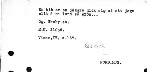 //// En bit av en jägare gick sig ut att jaga //// allt a en lund så gtön... //// T //// 8g. Ekeby sn. //// E.U. 21056. //// Visor,IV. s.167. //// NORD. ms. ////