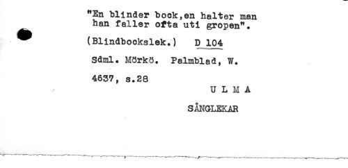 //// "En blinder book,en halter man //// han faller ofta uti gropen". //// ^ (Blindbockslek.) D 104 //// Sdml. M8rk8. Palmblad, W. //// 4637, s.28 //// U L M A //// SÅNGLEKAR //// -r ----_____r-.-^-..-____^ ^ ////