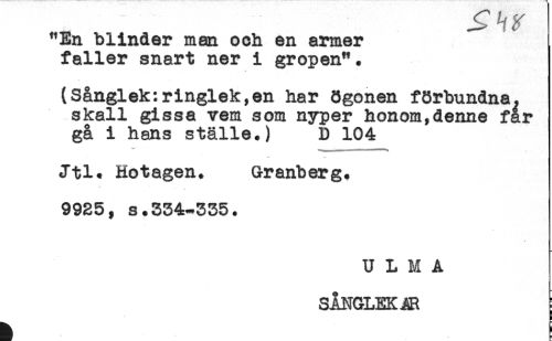 //// "En blinder man och en armer //// faller snart ner i gropen". //// ^ * //// (Sånglek:ringlek,en har ögonen förbundna, //// skall gissa vem som nyper honom,denne far //// gå i hans ställe.) D 104 //// Jtl. Hotagen. Granberg. //// 9925, s.534-335. //// U L M A //// SÅNGLEKAR ////
