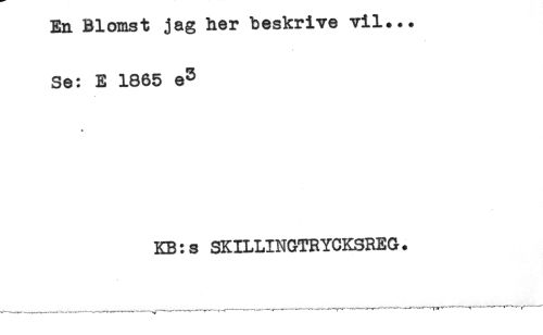 //// En Blomst jag her beskrive vil... //// Se: E 1865 e^ //// * //// KB:s SKILLINGTRYCKSREG. //// --- ---- ^ ' ^^ ^ ^ ////