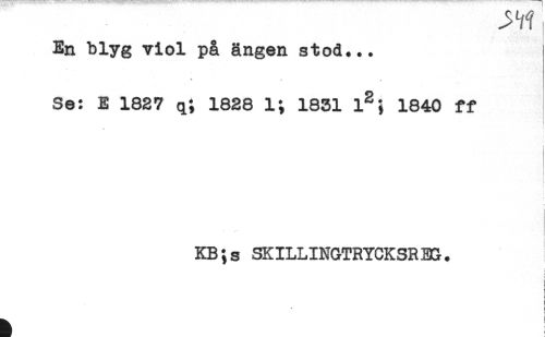//// En blyg viol på ängen stod... //// * * * //// Se: E 1827 q; 1828 1; 1831 1840 ff //// i //// i //// KB;s SKILLINGTRYCKSREG. //// i //// t //// i ////
