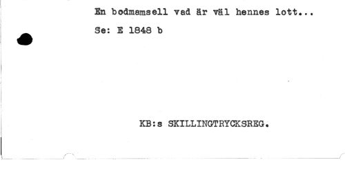 //// En bodmamsell vad är väl hennes lott... //// Se: E 1848 b //// ! //// y 4 //// ! //// f //// KB:s SKILLINGTRYCKSREG. ////