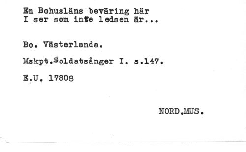 //// En Bohusläns beväring här //// I ser som in#e ledsen är... //// Bo. Västerlands. //// Mskpt.Soldatsånger 1. s.147. //// E.U. 17808 //// NORD.MUS. ////