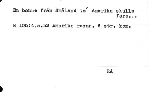 //// i //// ! //// [ //// En bonne från Småland te^ Amerika skulle //// fara... //// j //// B 105:4,s.52 Amerika resan. 6 str. kom. //// RA ////