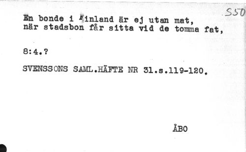 //// En bonde i Finland är ej utan mat, //// när stadsbon får sitta vid de tomma fat, //// 8:4.? //// < //// SVENSSONS SAML.HÄFTE NR 31.s.119-120. //// ÅBO ////