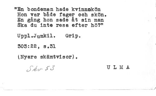 //// - - - I //// i //// "En bondeman hade kvinnakön //// Hon var både fager och skön. //// En gång hon sade åt sin man //// Ska du inte resa efter hö?" //// Uppl.Jumkil. Grip. //// 303:22, s.31 //// (Ny ar e skämtvi s or). //// ULM A //// ,... .... ... //// /
