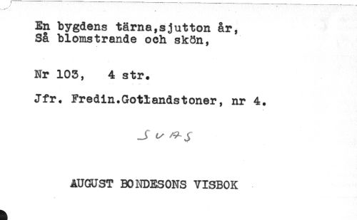 //// En bygdens tårna,sjutton år, //// Så blomstrande och skön, //// Nr 105, 4 str. //// Jfr. Fredin.Gotlandstoner, nr 4. //// AUGUST BONDESONS VISBOK ////