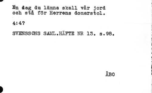 //// En dag du lämna skall vår jord //// och stå f8r Herrens domarstol. //// 4:4? //// SVENSSONS SAML.HÄFTE NR 13. s.98. ; //// g //// i //// ! //// i //// j //// ÅBO ^ ////