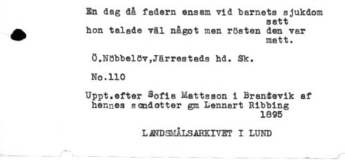 //// En dag då fadern ensam vid barnets sjukdom //// satt //// ^^ hon talade väl något men rösten den var //// ^^ matt. //// Ö.Nöbbelöv,Järreetads hd. Sk. //// No.110 //// Uppt.efter Sofia Mattsson i Branåevik af //// hennes sondotter gm Lennart Ribbing //// 1895 //// L#mSL,dLSARKIVET I LUND //// ..../ ...... ...... .... ...... ....^ y^* ////