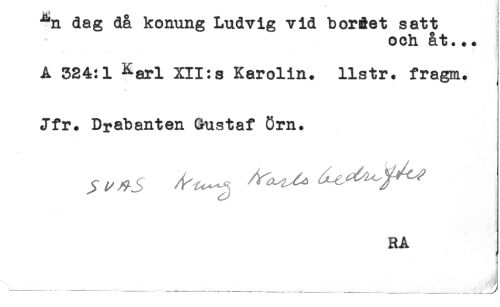 //// ^n dag då konung Ludvig vid borÉet satt //// och åt..+ //// A 524:1 Karl XII:s Karolin, llstr. fragm. //// Jfr. Dyabanten Gustaf 8m. //// RA //// < //// . ____ _ ^ j ////