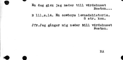 //// En dag gick jag ne der till värdshuset //// Boston. + * //// < //// B 111,s.14. En cowboys levnadshistoria. //// 8 str. kom. //// _ //// Jfr.Jag gångar mig neder till värdshuset //// Boston. //// t //// RA ////