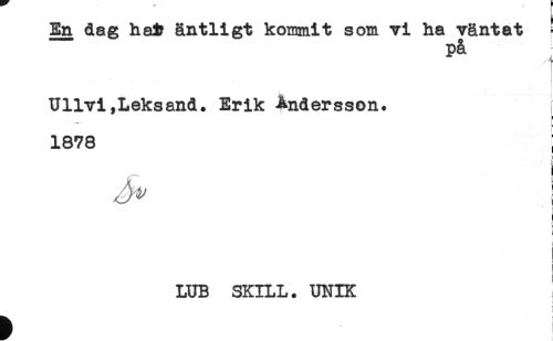 //// En dag hat äntligt kommit som vi ha väntat ^ //// på _ //// Ullvl,Leksand. Erik Andersson^ //// 1878 ; //// c //// t //// LUB SKILL. UNIK //// < //// i ////