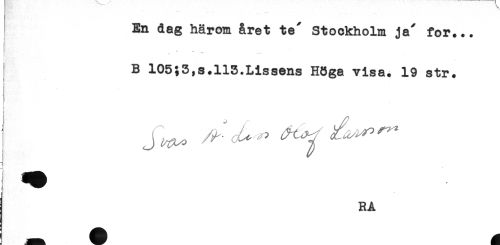 //// \ //// En dag härom året te' Stockholm ja' for... //// * * //// * ^ - - //// B 105;3,s.ll3.Lissens Höga visa. 19 str. //// ! //// i //// j RA ////