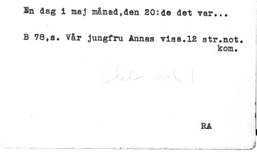 //// En dag i maj månad,den 30:de det var... //// - //// B Vår jungfru Annas visa.12 str.not* //// kom. //// RA I //// J //// - .----.,.. -----...-----r--^----- -----^ ////