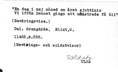 //// "En dag i maj månad om året sjuttinio //// Vi ifrån hemmet gingo att m&nstrade få bli" //// (Beväringsvisa.) //// Dal. Grangärde, Blixt,0. //// 11482,§.533. //// (Beväzings- och soldatvisor) //// uniA ////