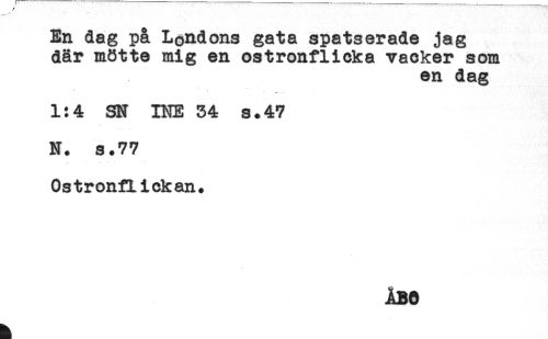 //// En dag på Londons gata spatserade jag //// där nötte mig en ostronflicka vacker som //// en dag //// * //// 1:4 SN INE 54 s.47 //// N. s.77 //// Ostronflickan. //// ÅBO ////