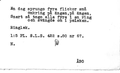 //// En dag sprungo fyra flickor små //// omkring pa ängen,på ängen, //// Snart sa togo alla fyra i en ring //// och svängde om i polskan. //// Ringlek. //// 1:5 PL. S.L.S. 422 s.80 nr 67. //// N. //// j //// ÅBO //// ^ ___ .,....,.. ////