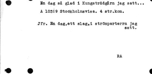 //// ^ En dag så glad i Kungsträdgärn jag satt... //// - * * . //// I A 10319 Stockholmsvisa. 4 str.kom. //// - //// < //// ... //// Jfr. En dag,ett slag+i strömparterrn jag //// satt. //// RA ////